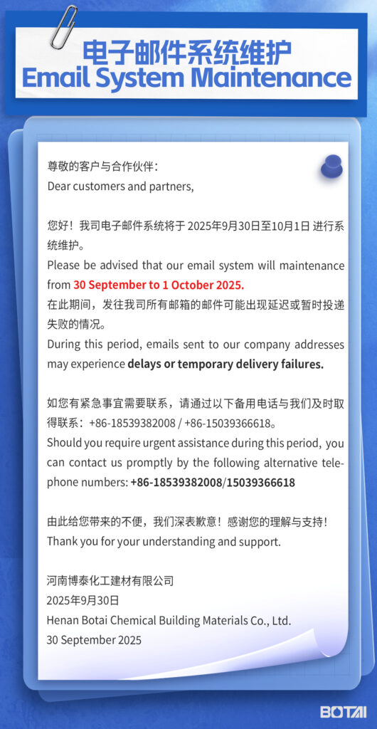 Henan Botai Chemical Building Materials Co., Ltd. was established in 2013. It is an innovative enterprise focusing on the research and development and sales of chemical raw material additives such as redispersible latex powder (RDP), cellulose ether (HPMC/HEMC/HEC), calcium formate and high-efficiency water reducer (SMF/PCE).